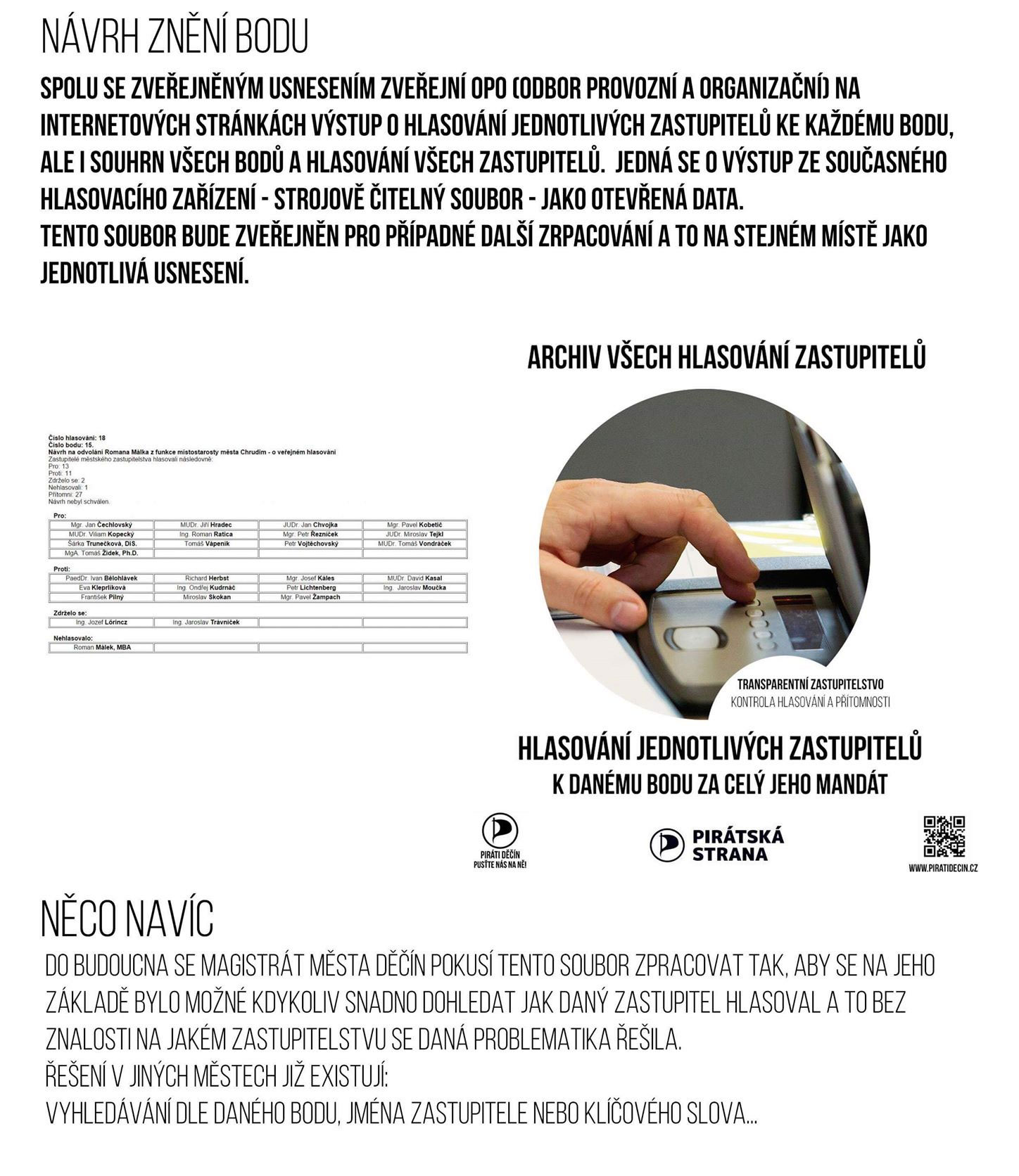 Dále jsme navrhli, aby bylo po každém jednání zastupitelstva zveřejněno, jak který zastupitel hlasoval o každém jednotlivém bodu hlasování. Máme za to, že volič má právo toto vědět, aby se mohl dotázat svého zastupitele, proč hlasoval tak či onak.