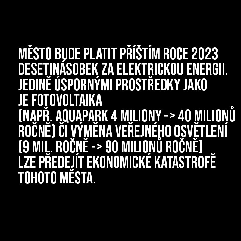 Město bude platit v příštím roce 2023 násobné ceny za elektrickou energii. Jedině úspornými prostředky jako je fotovoltaika na budovy města (např. Aquapark 4 miliony -> 40 milionů ročně) či výměna veřejného osvětlení (8 mil. ročně -> 80 milionů ročně) lze předejít ekonomické katastrofě tohoto města.